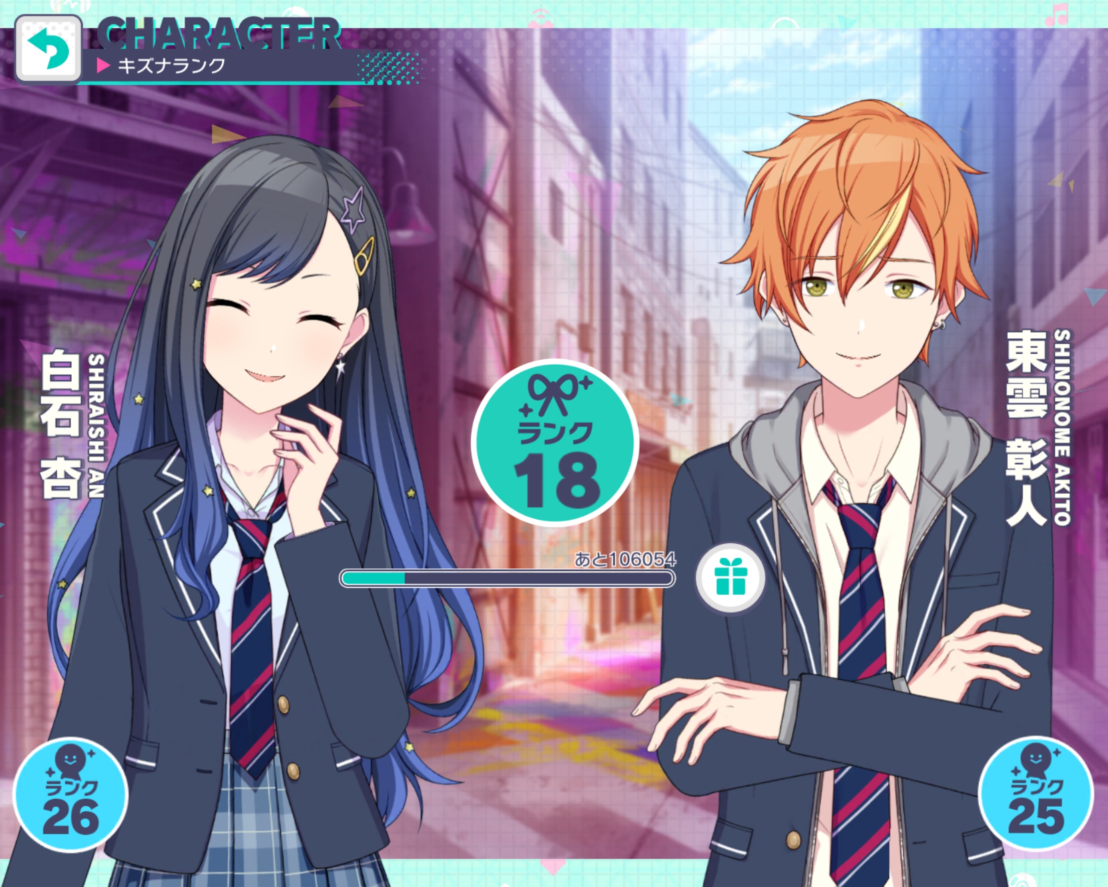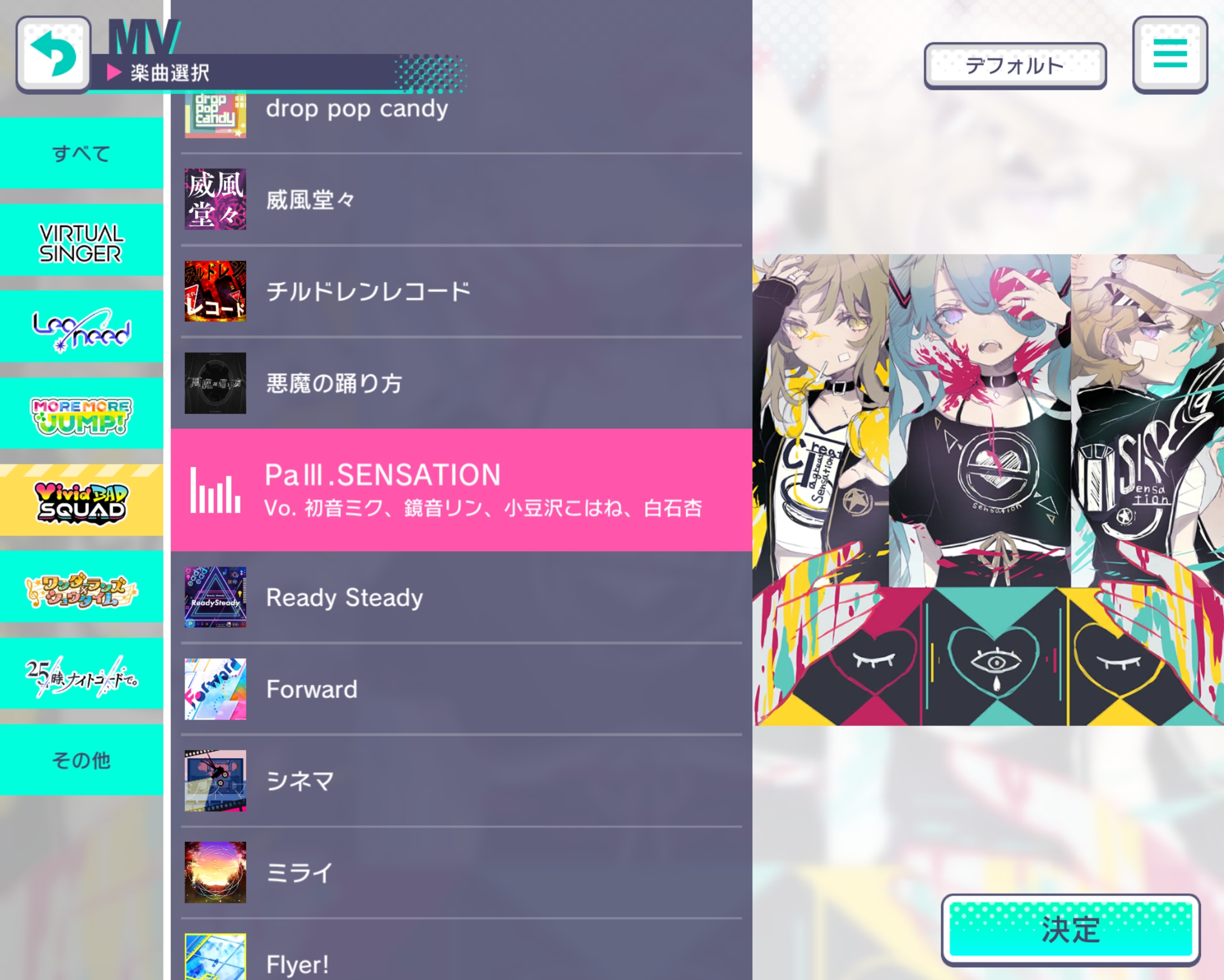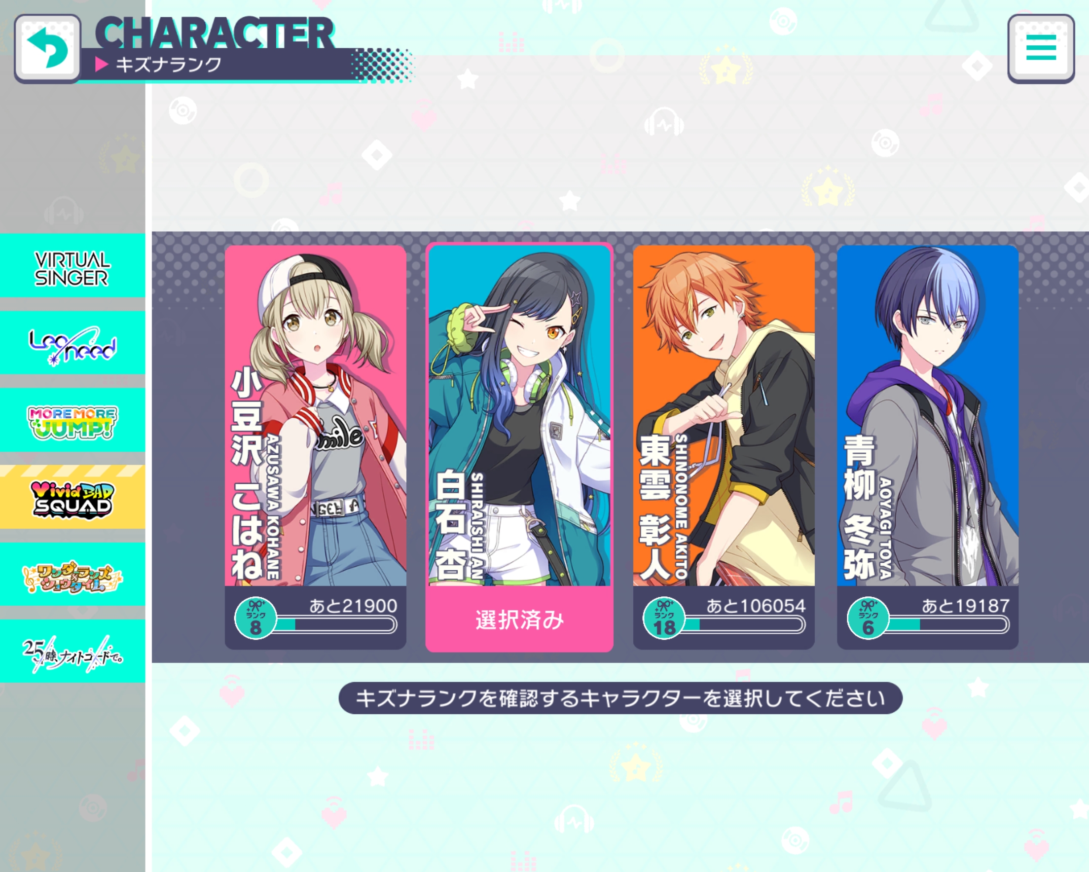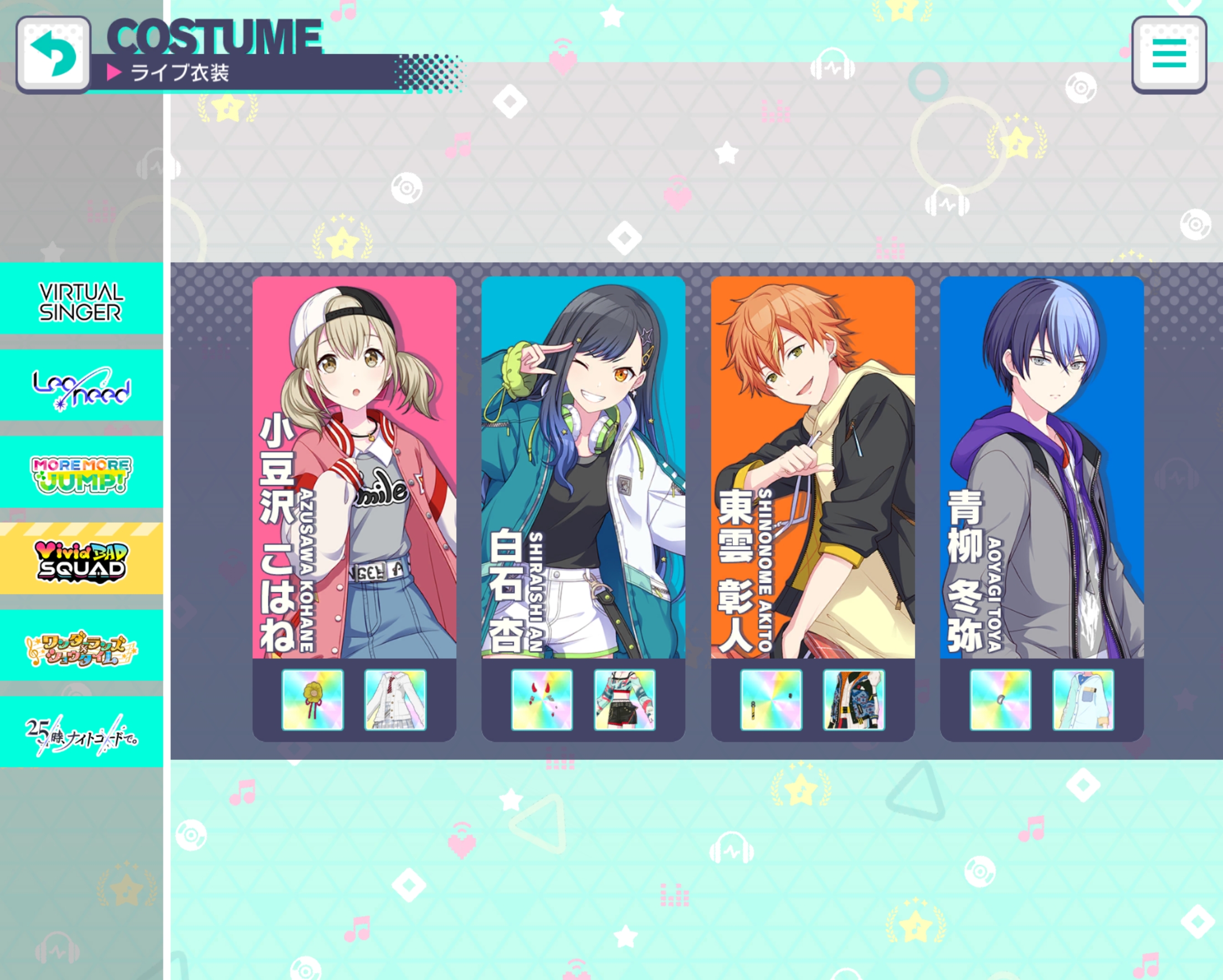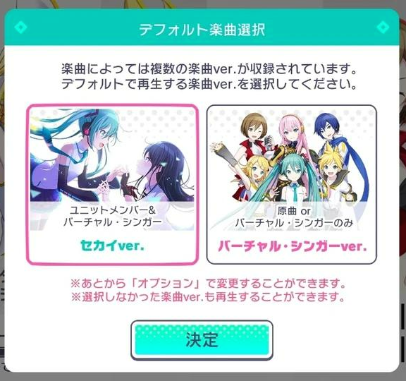 왼쪽이 세카이 버전, 오른쪽이 버추얼 싱어(보컬로이드) 버전이다. 원하는거 아무거나 고르면 된다.