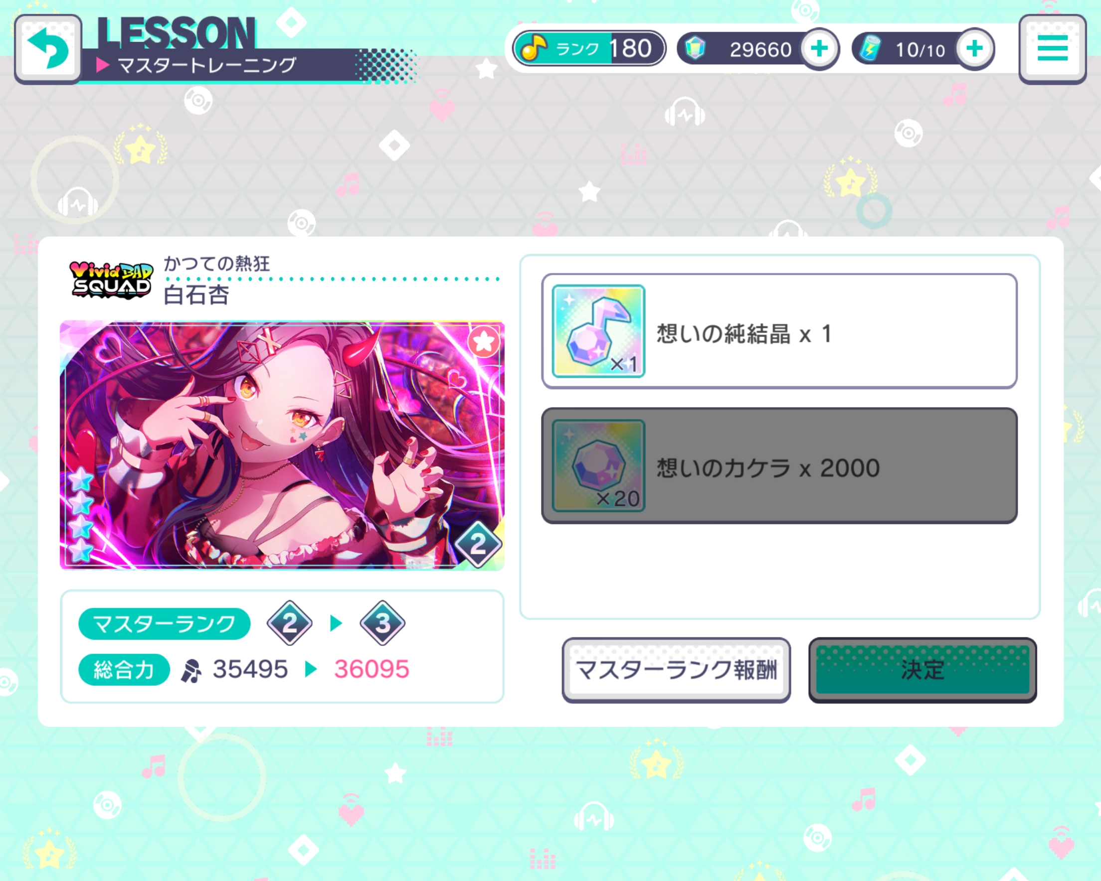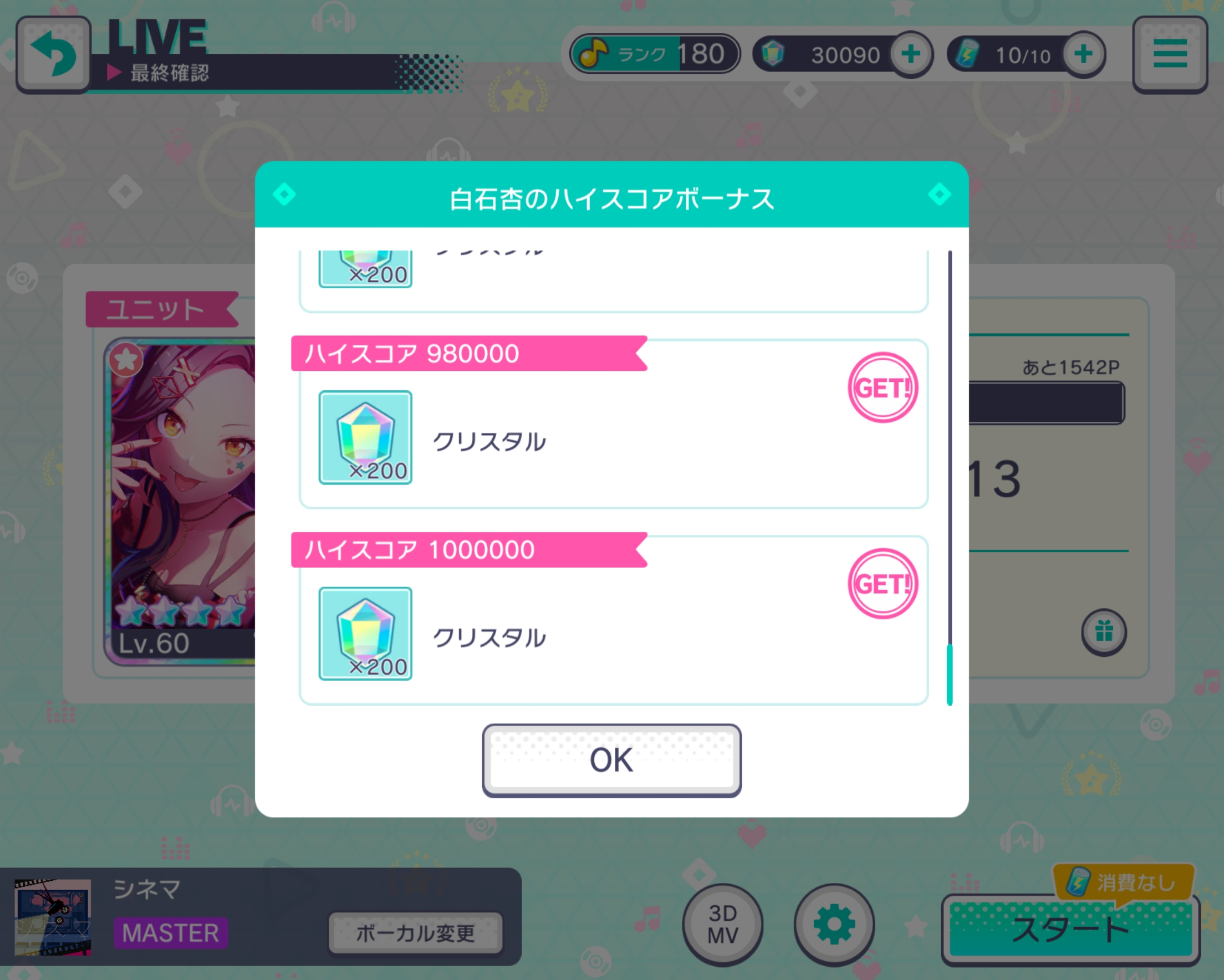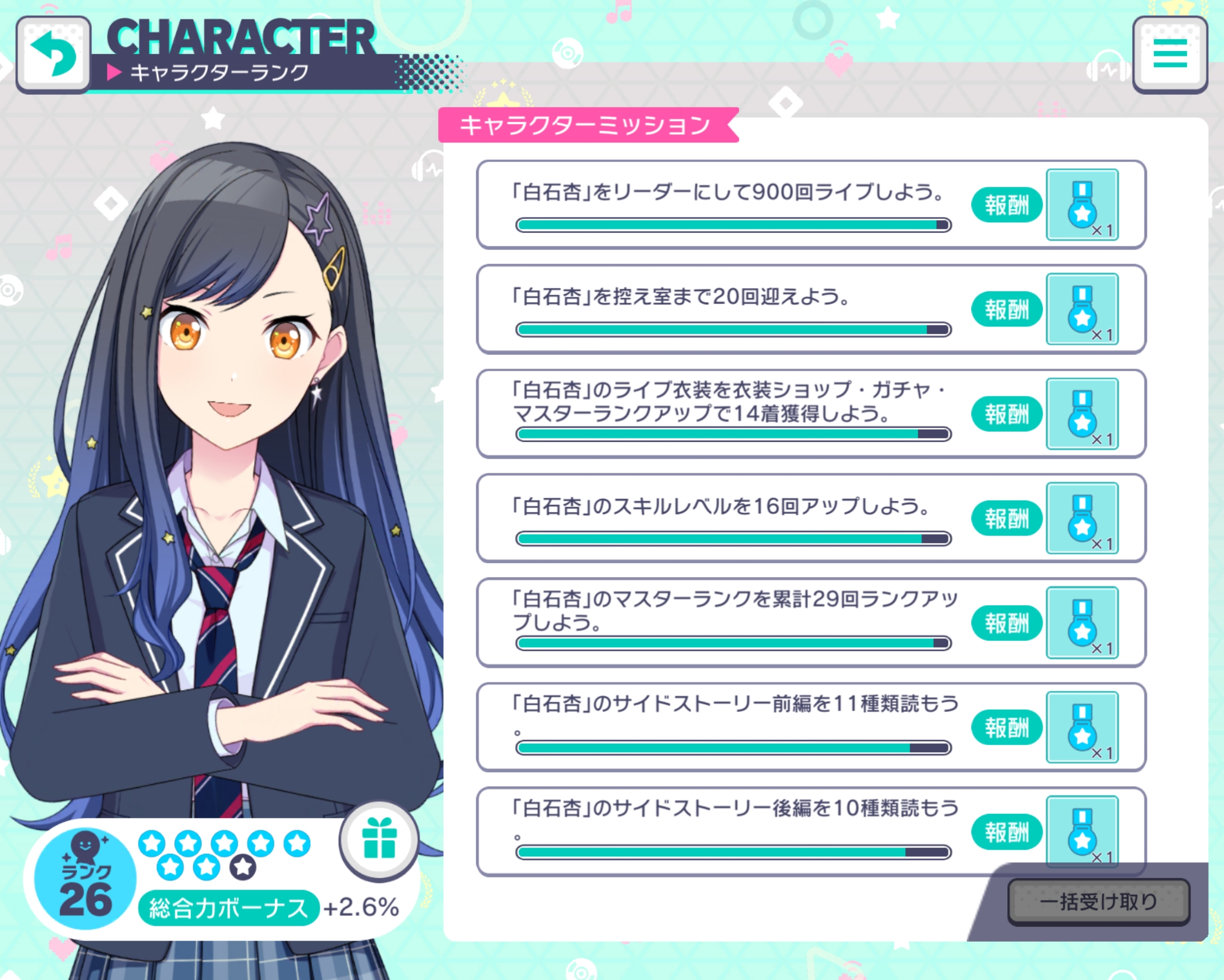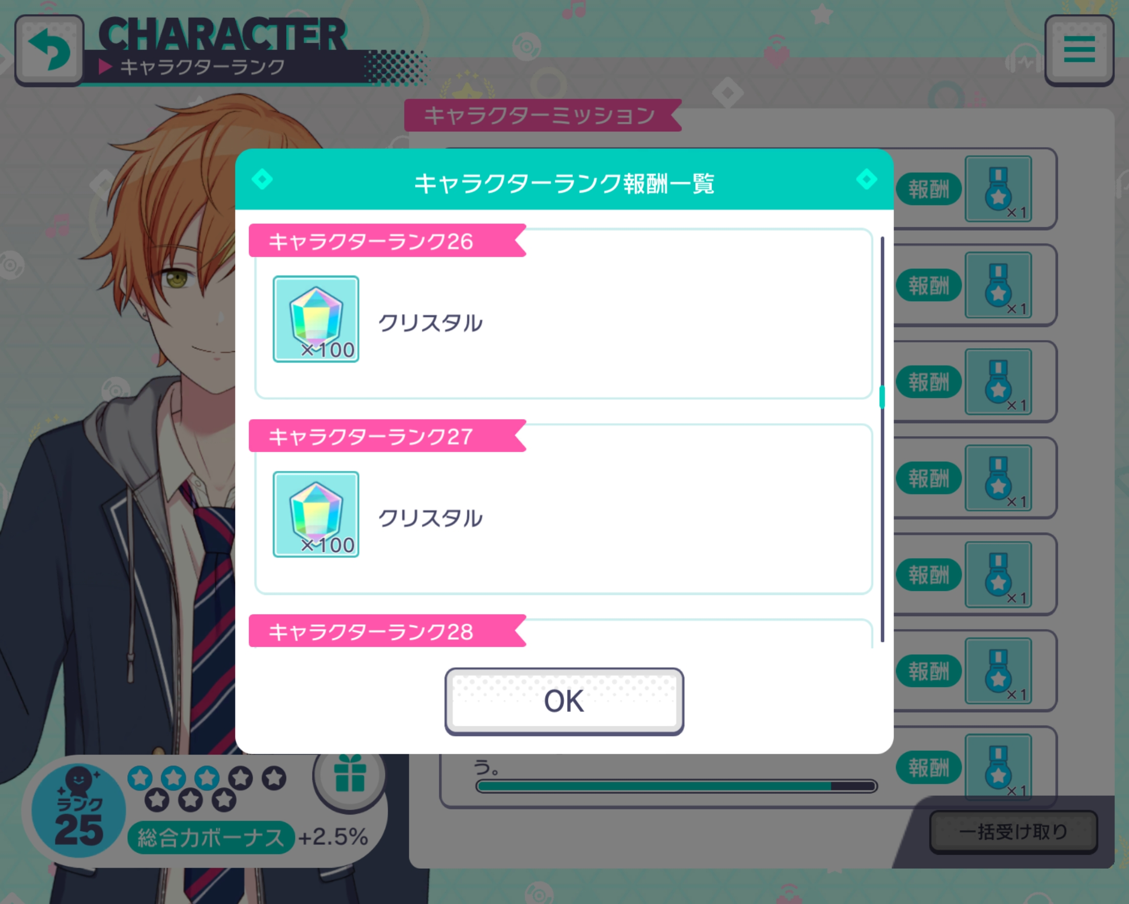 캐릭터 랭크 보상에 크리스탈만 있는 건 아니다. 해당 캐릭터 보컬 카드, 스탬프 티켓, 챌린지 라이브 카드 수 추가 등 오만게 다 들어 있다.