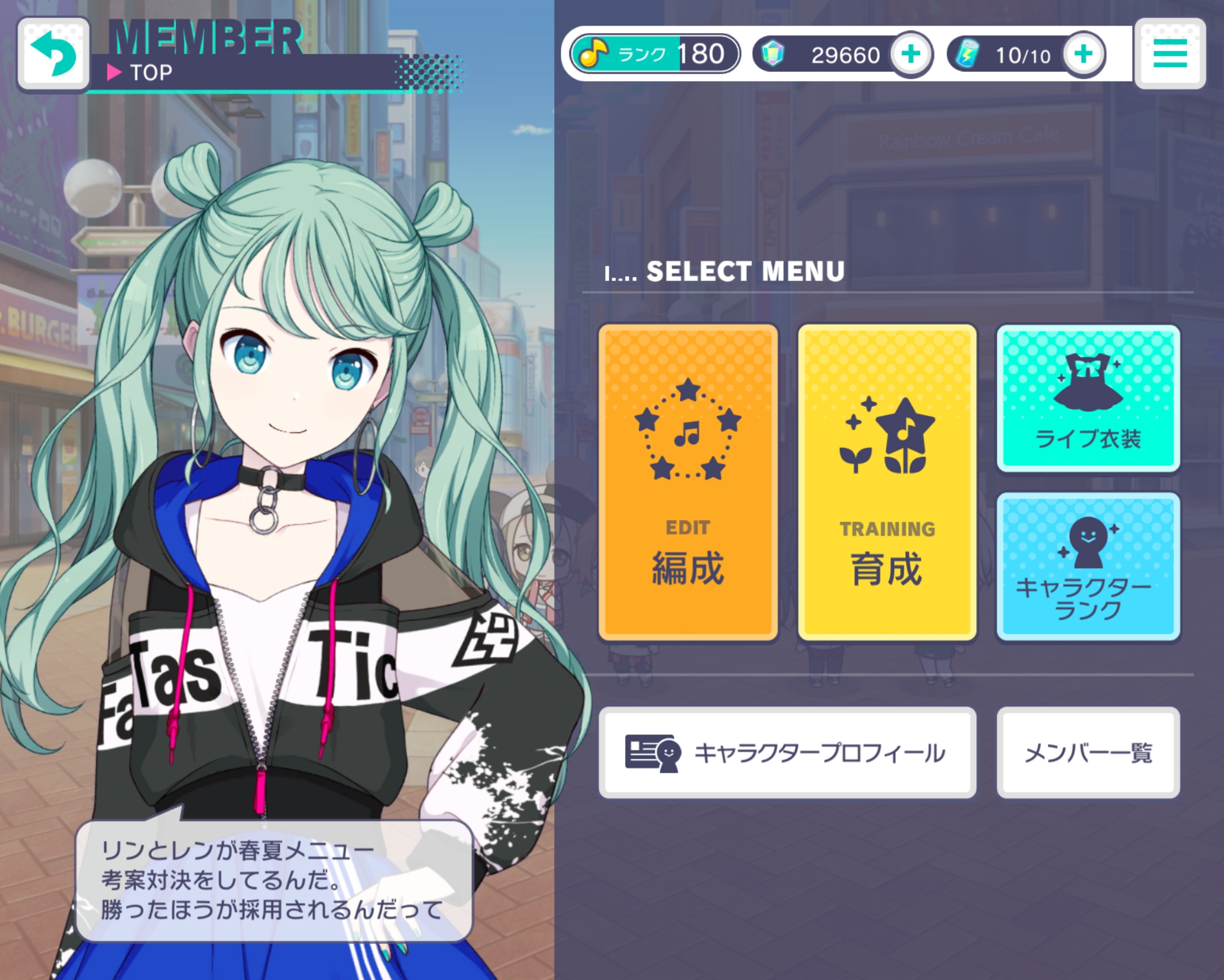 (좌→우) 편성 / 육성 / 라이브 의상 / 캐릭터 랭크 이고, 하단은 캐릭터 프로필 / 멤버 목록 이다.