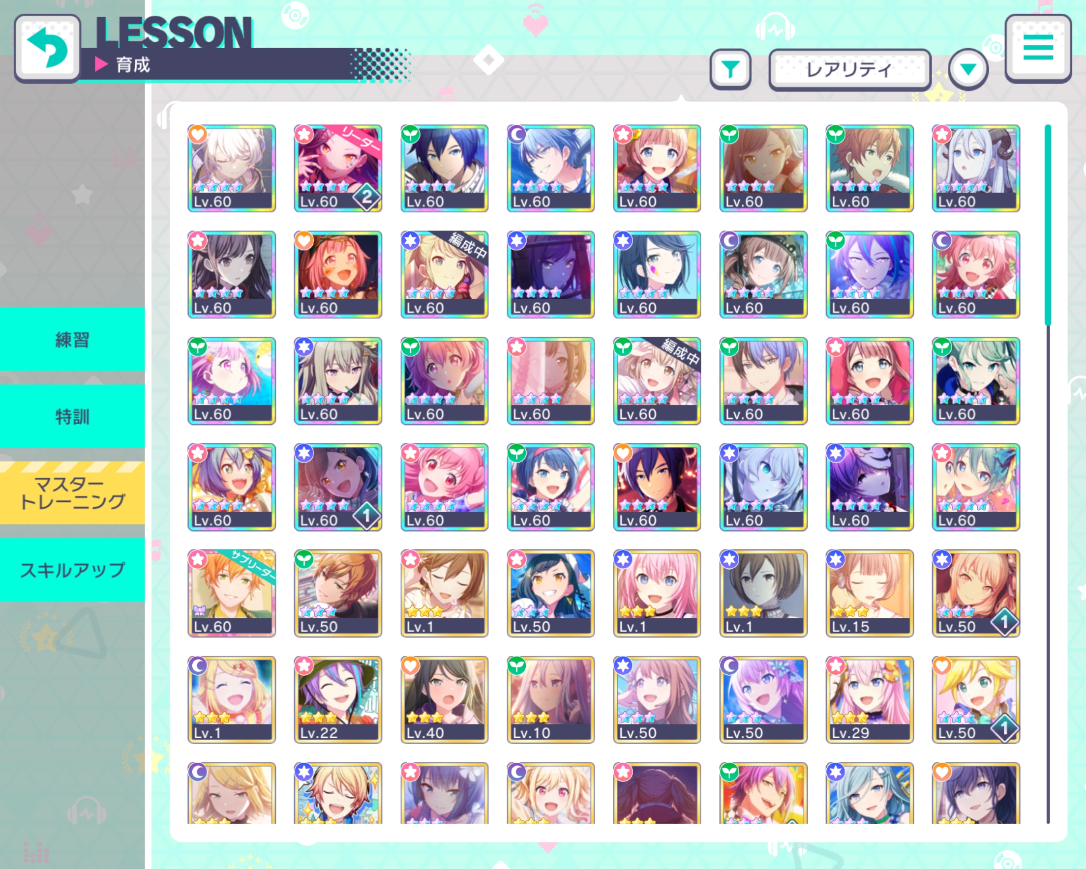 왼쪽 탭은 순서대로 (위→아래) 연습 / 특훈 / 마스터 랭크 / 스킬 업 이다.