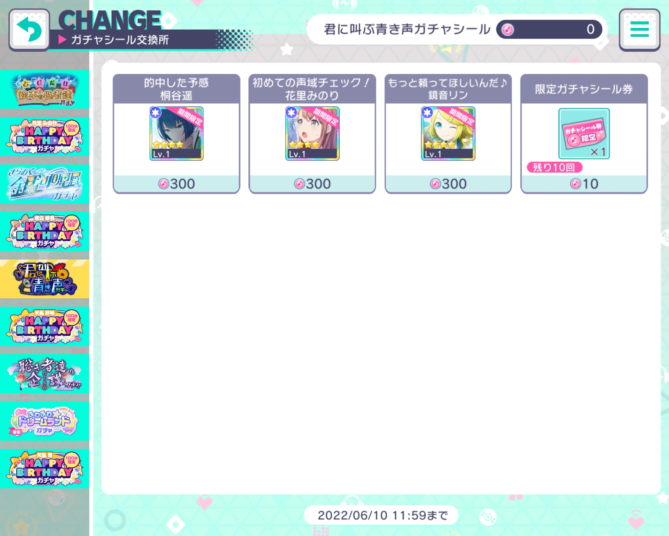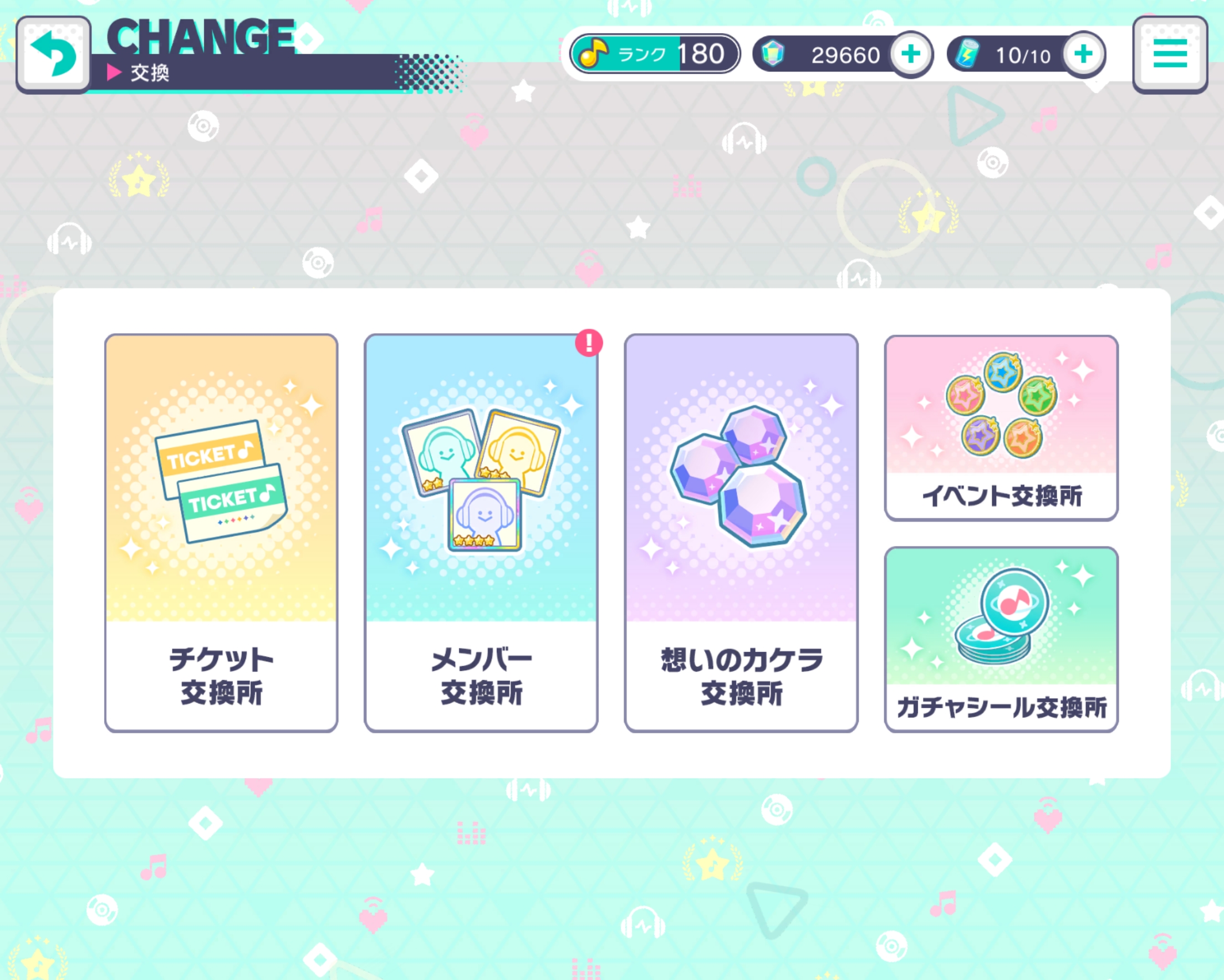 이벤트 교환소에서 바꿔먹을 수 있는 카드는 나중에 가차로 추가되므로 오시캐 아닌 이상 필사적으로 바꿔먹을 필요는 없는 것 같기도 하다. 뭐, 이건 사람마다 중요도가 다르므로...