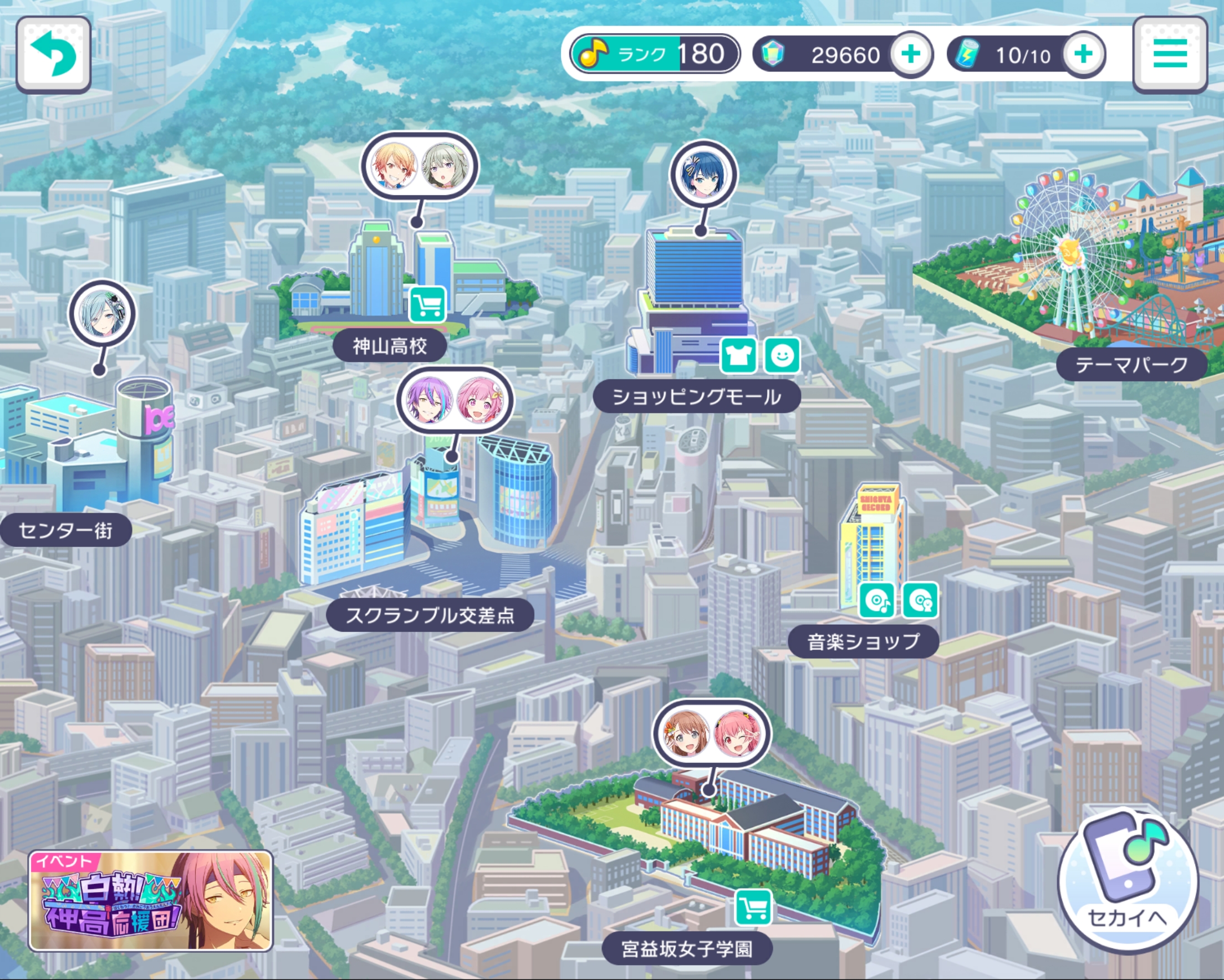 (좌→우) 중심가 / 카미야마 고등학교(이하 카미고) / 쇼핑몰 / 테마파크 / 스크램블 교차로 / 음악샵 / 미야마스자카 여학원(이하 미야죠) 순이다.