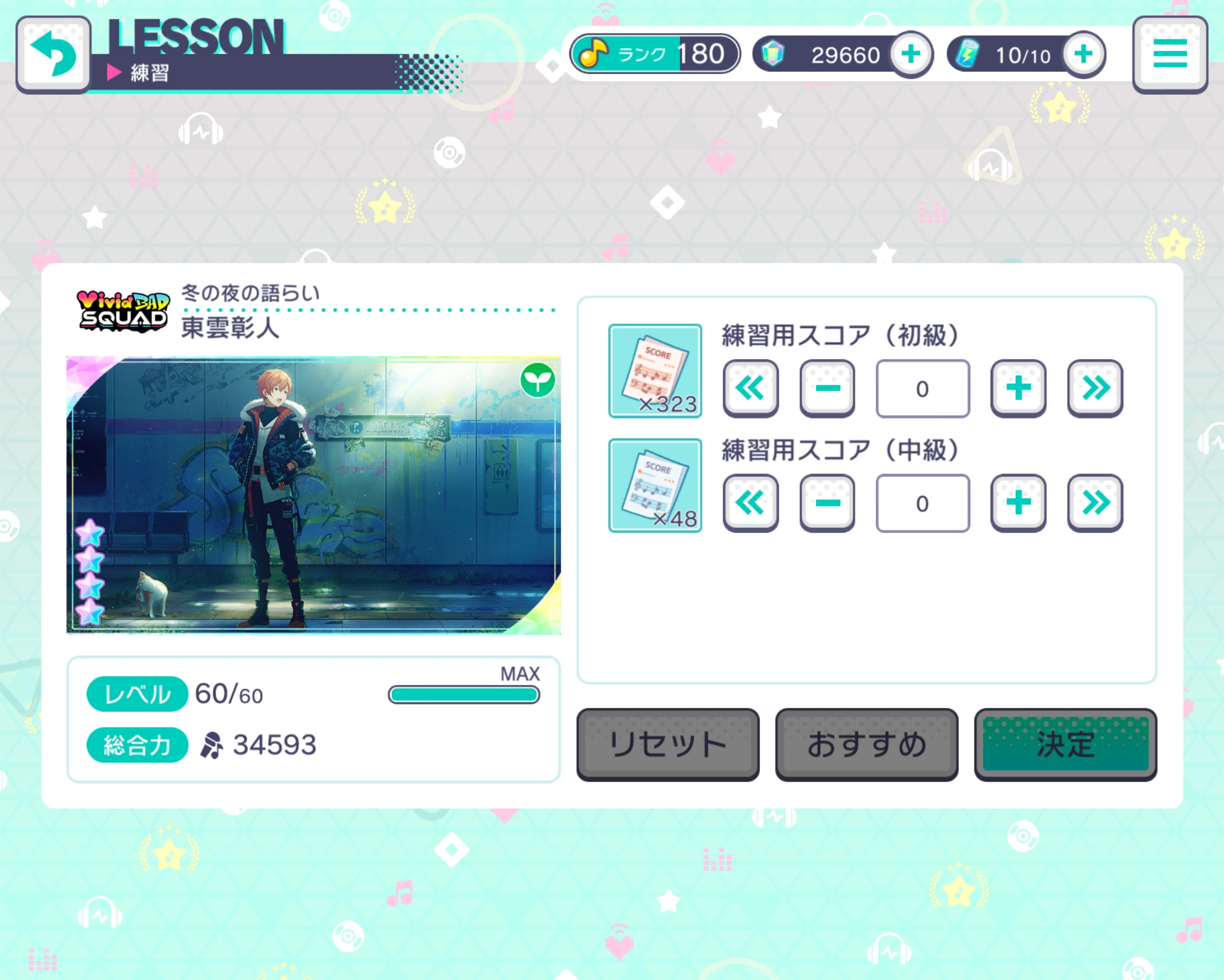 연습은 카드 레벨을 올릴 수 있는 메뉴로, 악보(스코어)가 필요하다. 초/중/고급이 있는 모양인데, 고급 악보는 한 번도 본 적이 없다. 존재 하는 아이템인지도 모르겠다. 일단 악보는 라이브 및 이벤트 코인 교환을 통해 획득 가능하다.