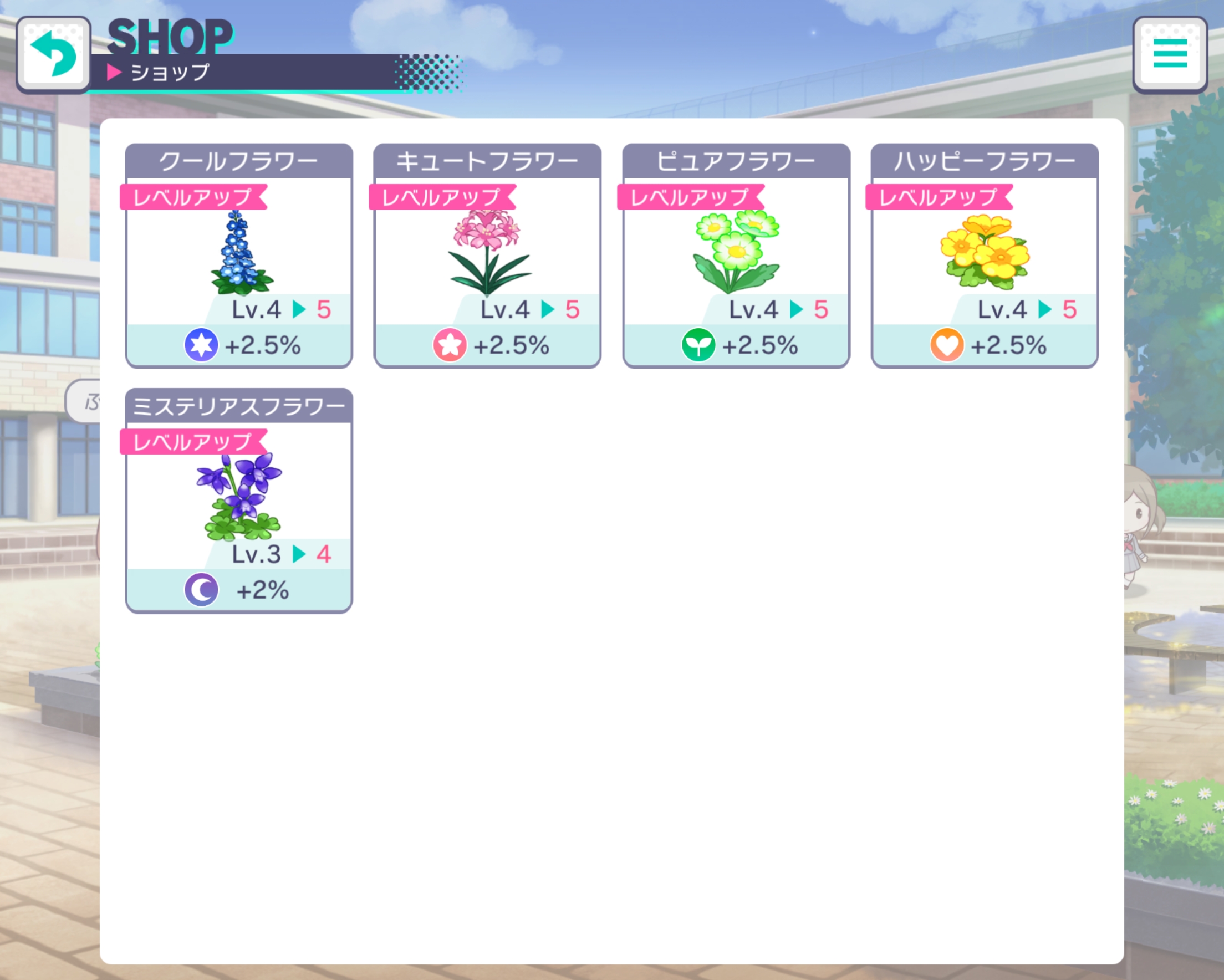 각 고등학교(카미고, 미야죠)에서는 속성 능력치 향상 아이템을 구매할 수 있다.